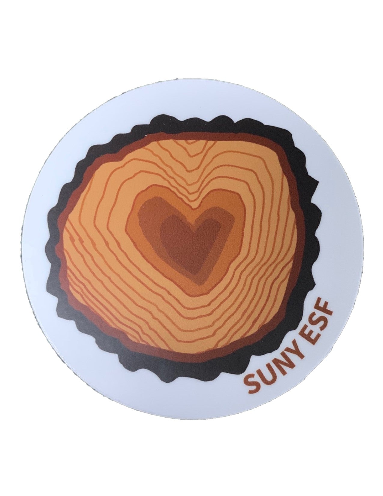 3" rounded corner sticker, student-designed with tree stump with heart shaped rings and SUNY ESF at the bottom
